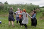 This is the meditative part of the performance, an invitation to the participants and the audience to a reflection about that every cloth, garment begins with a thread, about our relationship to wool, sheep, the earth we are standing on, on time, the time it takes to make a thread, a cloth, a garment by hand, about the value of hand made in our society.